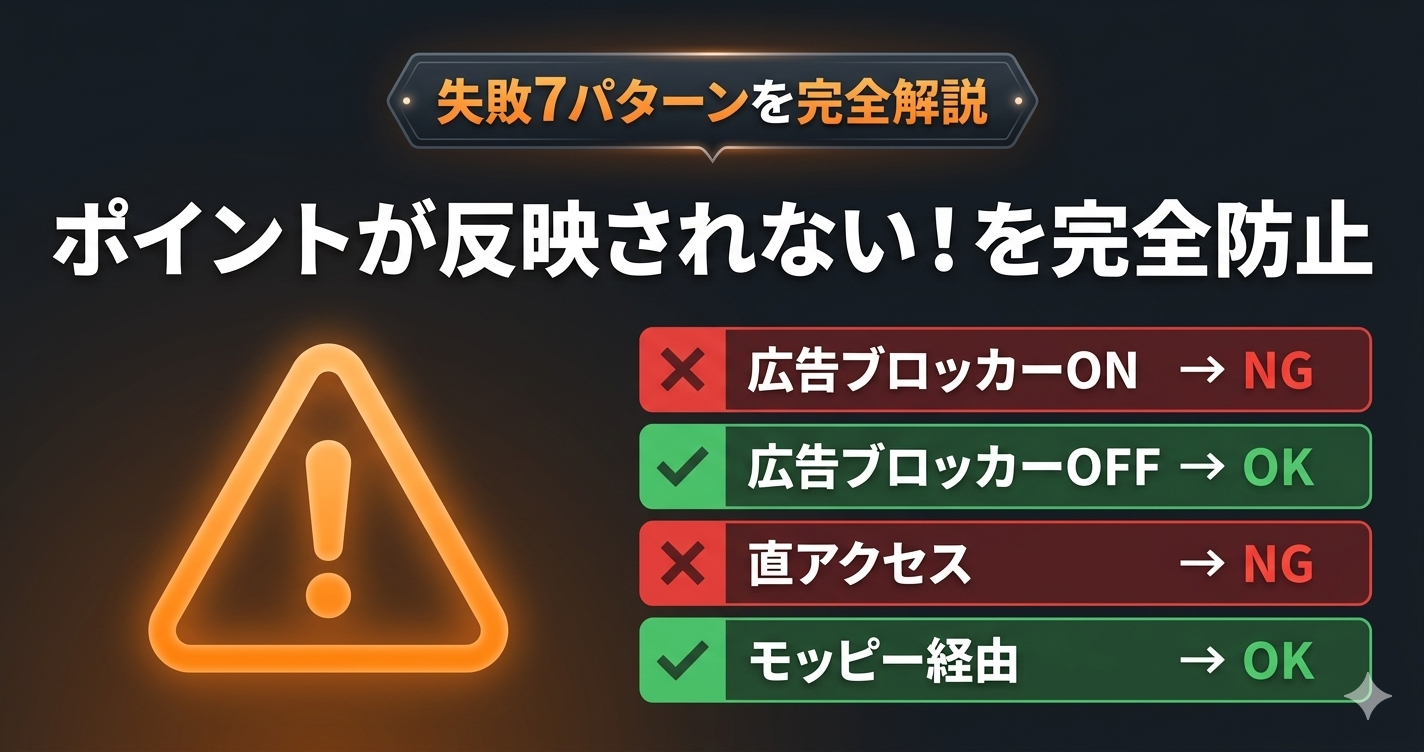 モッピーでポイントが付かない原因のほとんどは以下の3つです。