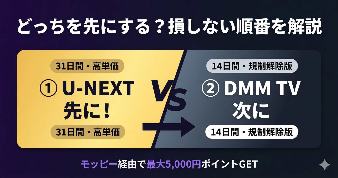 U-NEXTの31日間 vs DMM TVの14日間。長い無料期間を先に使うことで、焦らずゆっくり楽しめます。また、先にU-NEXTで豊富な作品ラインナップ(映画・ドラマ・漫画)を堪能してから、 後半にDMM TVで独自の規制解除版アニメを集中視聴するスタイルが理想的です。